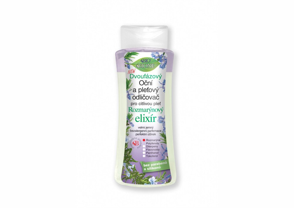 Na suché a mastné stíny a make-up. Ojedinělý prostředek k odlíčení a vyčištění pokožky víček, očních partií i celého obličeje. Rozmarýnový extrakt obsahuje řadu bioaktivních sloučenin s příznivými účinky na pokožku. Kyselina kávová, oleanolová, rozmarýnová, karnosová, ursolová, karnosol, apigenin, luteolin, rosmanol, hesperetin a další antioxidanty a polyfenolické látky. Kosmetické přípravky s rozmarýnovým extraktem jsou léta používány pro své údajné účinky na ochranu pokožky před oxidanty, blokují vlastní degradační enzymy pokožky (elastáza, kolagenáza aj.) Rychle, šetrně odstraní suché i mastné stíny, ale pleť zvláční a zregeneruje. Odličovač je dvoufázový. Horní olejová fáze precizně rozpustí všechny mastné složky dekorativní kosmetiky a pleť perfektně vyčistí. Hlavní podíl olejové složky se z pleti postupně odpařuje a pleť zůstane vláčná, čistá, vyživená. Vodná fáze odstraní všechny ve vodě rozpustné nečistoty, soli pot aj. Před použitím řádně protřepejte a ihned na odličovací tampon naneste odličovač a lehkým otíráním pleť vyčistěte. Elegantní a moderní dvoufázový systém umožňuje dosažení perfektního účinku bez emulgátorů.