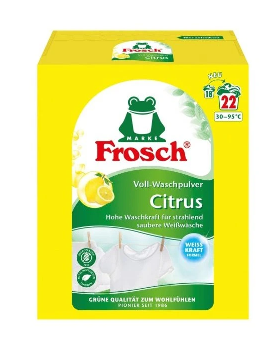 Frosch univerzální prací prášek - citrus je šetrný a ekologický prostředek navržený pro praní bílého i stálobarevného prádla. Tento prací prášek kombinuje sílu přírodních citrusových extraktů s moderními čistícími technologiemi, aby zajistil dokonalou čistotu vašeho prádla. Jeho složení efektivně odstraňuje odolné skvrny, například od kávy, čaje, ovoce nebo trávy, a přitom respektuje potřeby citlivé pokožky i životního prostředí. Prášek je vhodný pro praní při teplotách od 20 °C do 95 °C, což jej činí ideálním pro každodenní použití i pro intenzivní hygienické praní.