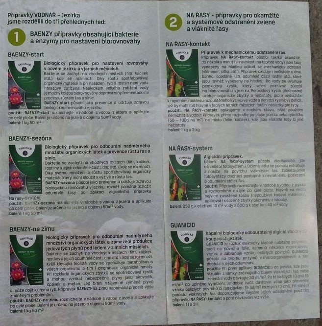 Přípravek rozmíchejte v nádobě s vodou z jezírka a rovnoměrně rozlijte po celé ploše (nepoužívat kovové materiály). Aplikovat i usazené zbytky přípravku z nádoby. Doporučujeme vypnout UV lampu. Dodržujte přesné dávkování!