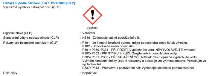 Označení podle nařízení (ES) č.1272/2008 [CLP] Výstražné symboly nebezpečnosti (CLP) : GHS07 Signální slovo (CLP) : Varování Standardní věty o nebezpečnosti (CLP) : H319 - Způsobuje vážné podráždění očí. Pokyny pro bezpečné zacházení (CLP) : P101 - Je-li nutná lékařská pomoc, mějte po ruce obal nebo štítek výrobku. P102 - Uchovávejte mimo dosah dětí. P301+P330+P331 - PŘI POŽITÍ : Vypláchněte ústa. NEVYVOLÁVEJTE zvracení. P302+P352 - PŘI STYKU S KŮŽÍ: Omyjte velkým množstvím vody/…. P305+P351+P338 - PŘI ZASAŽENÍ OČÍ: Několik minut opatrně vyplachujte vodou. Vyjměte kontaktní čočky, jsou-li nasazeny a pokud je lze vyjmout snadno. Pokračujte ve vyplachování. P337+P313 - Přetrvává-li podráždění očí: Vyhledejte lékařskou pomoc/ošetření. Další věty : Nepožívat. 2.3. Další nebezpečnost Další rizika, která nejsou do klasifikace zahrnuta : Za běžných podmínek žádné.