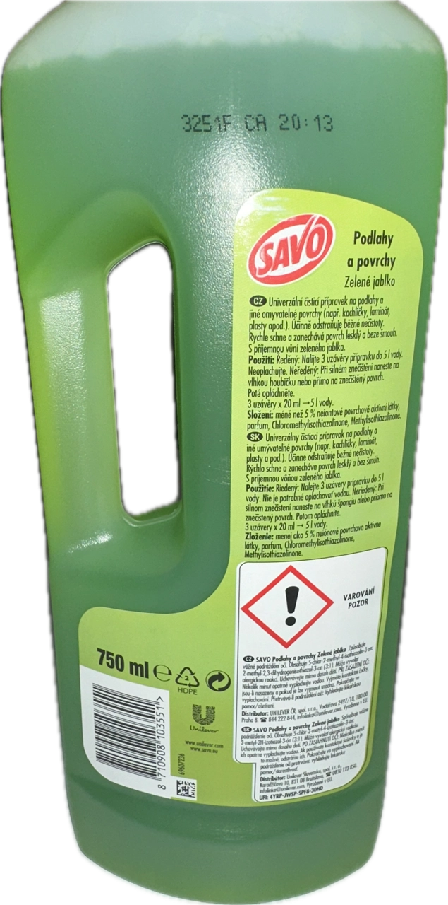 Popis Savo univerzální čistící přípravek na podlahy a jiné omyvatelné povrchy (např. kachličky, laminát, plasty apod.). Účinně odstraňuje běžné nečistoty. Rychle schne a zanechává povrch lesklý a beze šmouh. Váš domov provoní jablečnou vůní.
