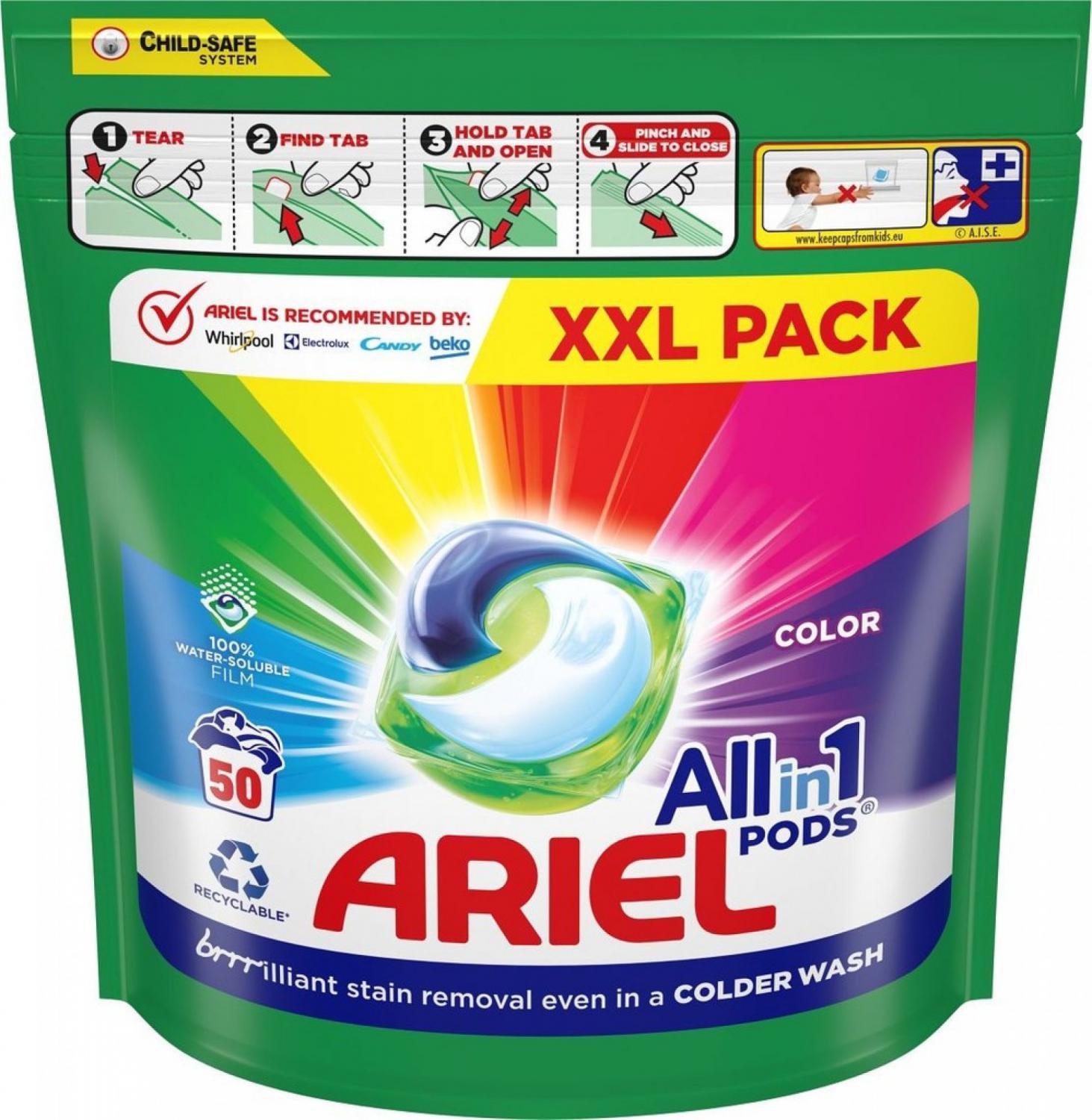 Kapsle na praní Ariel All-in-1 PODS Color mají skvělé účinky při odstraňování skvrn už od prvního praní při nižší teplotě. Výjimečné prací účinky v jedné kapsli na praní: 1. Odstraňují skvrny 2. Hygienická čistota 3. Osvěžují 4. Skvělé pro praní při nízké teplotě díky technologii COOL CLEAN 5. obal 100% rozpustný ve vodě. Kapsle na praní Ariel s chytrým vícekomorovým designem udrží složky oddělené do té doby, než se namočí. Po kontaktu s vodou se obal kapslí rozpustí a uvolní účinné technologie, které odstraňují skvrny. Kapsle na praní prádla Ariel All-in-1 PODS se navíc dodávají v recyklovatelném obalu. VAROVÁNÍ! Tento výrobek může být škodlivý a způsobit vážná zranění. Kapsle Ariel All-in-1 PODS uchovávejte mimo dosah dětí.
